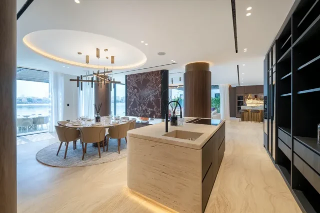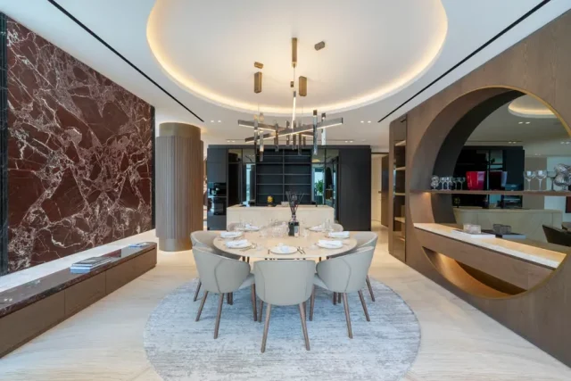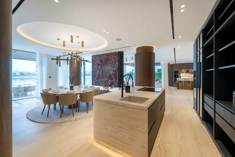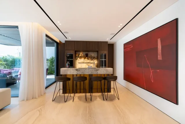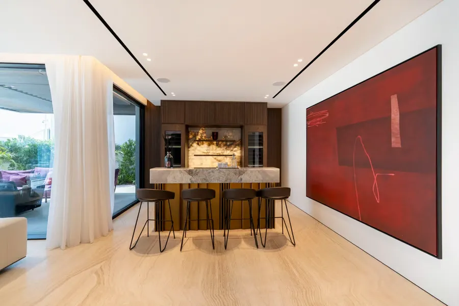A stylish bar area with wooden cabinetry and a striking counter adjoins. Meanwhile, the wooden pillars separate the living areas from a striking dining area and show kitchen.