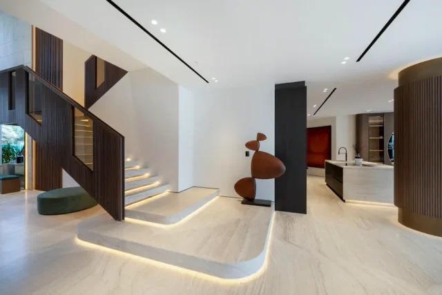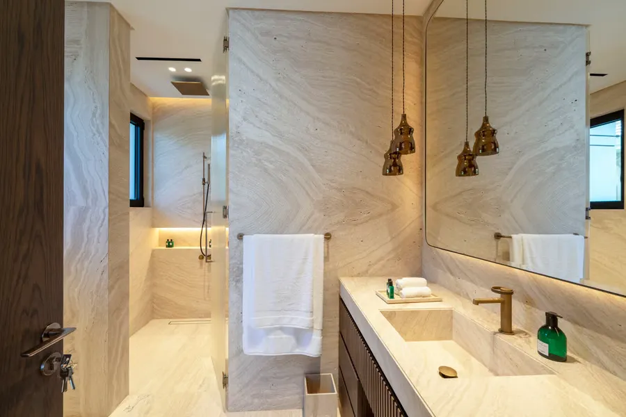 This relaxed air flows into the interiors, which are expansive and feature a contemporary design. Chic furniture, soft colours, and arresting design features including wooden pillars and marble splashes make for an elegant, private atmosphere. Panoramic floor-to-ceiling windows allow for the views and natural light to pour in.
